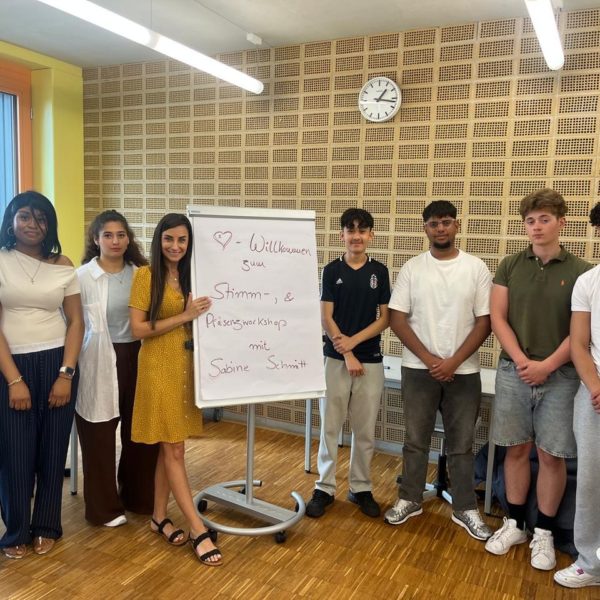Die Schülerinnen und Schüler der 10 b erarbeiteten im Rahmen des Startchancen-Programms Übungen im Bereich des Stimmtrainings. Zahlreiche Artikulationsübungen führten zu einer systematischen Potenzialförderung und vermittelten Wissen hinsichtlich der Wirkung von Körpersprache und Stimme. Die geübten Methoden der Theaterpädagogik, Linguistik und Logopädie brachten die Jugendlichen zum Staunen. Zukünftig wird der Einsatz ihrer Stimme bei Präsentationen, Vorstellungsgesprächen und Vorträgen souveräner genutzt werden können. Einen herzlichen Dank an die Theaterpädagogin und Hörbuch- und Synchronsprecherin Sabine Schmitt für die tollen Tipps, Tricks und die liebevolle Förderung in puncto Präsenztraining.